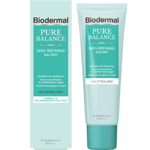 Biodermal Pure Balance Skin Refining Nacht Balsem is een verzorgende nachtcrème en speciaal ontwikkeld voor een volwassen huid met onzuiverheden en oneffenheden. De combinatie van effectieve ingrediënten verbetert de huidtextuur en huidteint, exfoliëert de huid op milde wijze en gaat op deze manier onzuiverheden en oneffenheden tegen. Met als resultaat een zachte, egale en stralende huid die in balans is.
