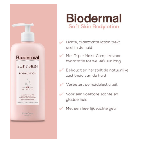 Biodermal Soft Skin Bodylotion is een lichte, zijdezachte lotion met heerlijk zachte geur. De lotion is speciaal ontwikkeld voor de normale huid en trekt snel in. De formule is verrijkt met het Triple Moist Complex, een combinatie van effectieve, hydraterende ingrediënten voor directe, intensieve en langdurige hydratatie tot wel 48 uur lang. Zo behoudt en herstelt de lotion de natuurlijke zachtheid van de huid en wordt de huidelasticiteit verbeterd. Met als resultaat een voelbaar zachte, soepele en gladde huid.