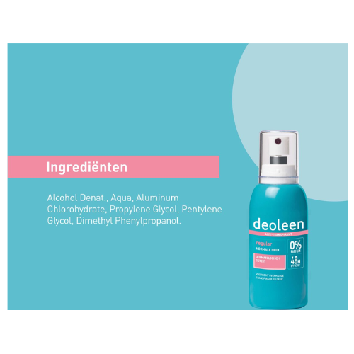 Deoleen Regular Pompspray is speciaal samengesteld om effectief en op milde wijze overmatige transpiratie te voorkomen, zonder de natuurlijke balans te verstoren. Deoleen camoufleert de transpiratiegeur niet met sterke parfum, aangezien parfumstoffen allergieën kunnen opwekken. In plaats daarvan neutraliseert Deoleen de transpiratiegeur door ongewenste bacteriegroei te voorkomen. Deoleen, Voorkomen is beter dan camoufleren.