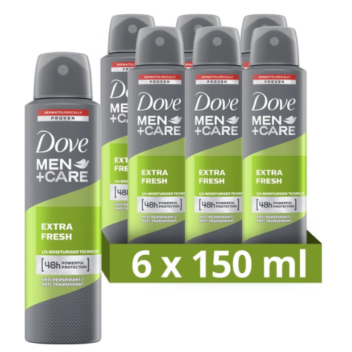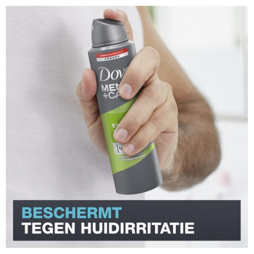 Dove Men+Care anti-transpirant spray is hard tegen zweet, maar zacht voor de huid. Als je regelmatig onderweg bent en veel sport, waardeer je het gemak van een langdurig werkende deodorant spray. Dankzij de dermatologische geteste formule van Dove Men+Care Extra Fresh anti-transpirant spray ben je tot 48 uur krachtig beschermd tegen zweet en ongewenste lichaamsgeuren. Bovendien bevat het de 1/4 hydraterende crème van Dove, die de huid verzorgt en beschermt tegen irritatie onder de oksels. Het extra frisse parfum is de hele dag subtiel aanwezig. Geen compromissen op het gebied van kwaliteit, kracht of comfort.