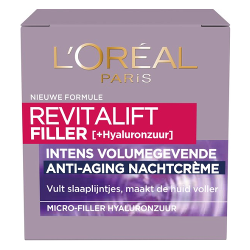 L’Oréal Paris Revitalift Filler Nachtcrème - Anti-Rimpel Gezichtsverzorging - 50 mlAnti-aging nachtcrème verrijkt met micro-hyaluronzuur en fibroxyl voor zichtbaar vollere en stevigere huid.ProductbeschrijvingWakker worden met een stralend en glad uitziende huid zonder slaaplijntjes? De L’Oréal Paris Revitalift Filler anti-rimpel nachtcrème bevat een formule met een hoge concentratie hyaluronzuur die de huid meer volume geeft.De huid voelt intens gehydrateerd en oogt frisserVerrijkt met micro-hyaluronzuur voor een stevigere huidVult zichtbaar rimpels en slaaplijntjes en maakt de huid vollerGeschikt voor alle huidtypes, voor vrouwen vanaf 35 jaarDeze unieke nachtcrème is verrijkt met galanga, een plantaardig extract, dat helpt slaaplijntjes zichtbaar te verminderen. Daarnaast bevat de exclusieve formule een hoge concentratie micro-hyaluronzuur, dat de huid geleidelijk meer volume geeftHet resultaatNa applicatie van de Revitalift Filler Nachtcrème zal de huid direct gehydrateerd aanvoelen en zichtbaar frisser lijken. Over een periode van 4 weken zullen rimpels zichtbaar zijn verminderd (voorhoofd -16%, kraaienpootjes -11%, neus-lipplooien -8%*), is de huid voller, zijn wangen verstevigd en zal het volume in het gezicht zichtbaar zijn verbeterd. * Klinische test met 58 vrouwen.