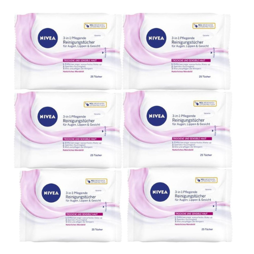 NIVEA 3-in1 Verfrissende Reinigingsdoekjes - Make-up Remover Doekjes - Droge huid - Amandelolie - Gezichtsreiniger - 6 x 25 stuks