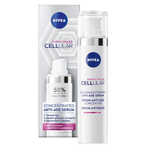 Twee ingrediënten zorgen samen voor de verstevigende werking van dit serum voor je gezicht. Het bestanddeel puur foliumzuur is effectief op het niveau van de huidcellen en draagt bij aan het versterken van de ondersteunende vezels* voor een stevigere en meer volumineuze huid Geef je je huid dagelijks een boost collageen met dit serum? Dan voel je dat deze veerkrachtiger aanvoelt en bovendien gladder oogt. Met 50% extra Hyaluronzuur biedt het een krachtig anti-aging effect. Hyaluronzuur is ook juist uitstekend in het vasthouden van vocht. Zo geniet je huid van diepe hydratatie en weet je zeker dat de vochtbalans op peil blijft. Het NIVEA Cellular Expert Filler Anti-Age Serum zorgt voor een merkbare hydratatie van de huid, verbetert de teint aanzienlijk, en verhoogt de stevigheid en elasticiteit van de huid. Hierdoor wordt de huid uniformer en worden rimpels aanzienlijk minder zichtbaar. De huidtolerantie is dermatologisch bevestigd. *in vitro getest.
