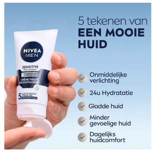 NIVEA MEN Sensitive Gezichtscrème voor de gevoelige huid voedt de huid intensief zonder restjes achter te laten. Het verzacht de huid en helpt huidirritaties te voorkomen dankzij de combinatie van Kamille en Hamamelis. De lichte crème formule met 0% alcohol geeft geen branderig gevoel en trekt snel in. Geeft de gevoelige huid een comfortabel en relaxed gevoel en laat de huid er gezond uitzien.