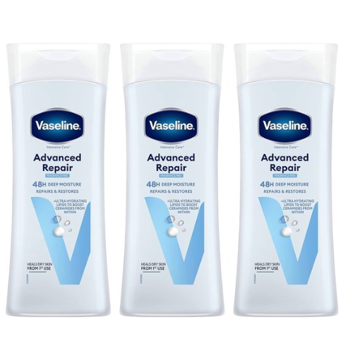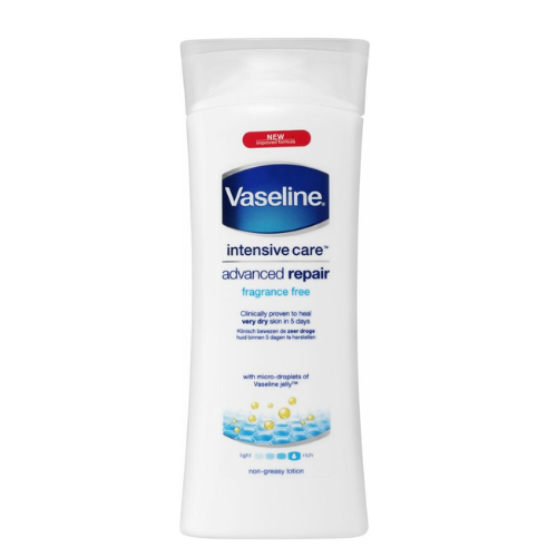Vaseline Bodylotion Advanced Repair hydrateert diep om de droge huid te verzachten en te herstellen.